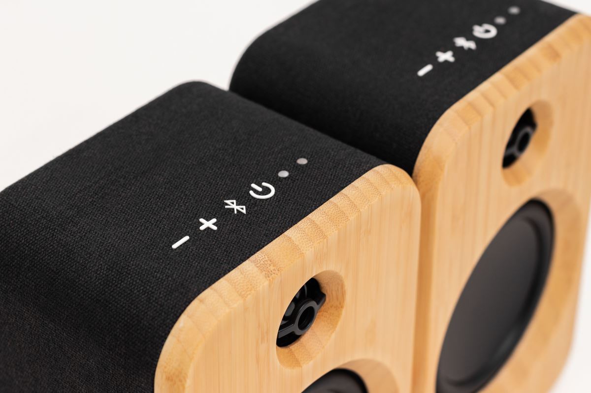 Reproduktory kombinují masivní bambus a tkaninu REWIND™, vyrobenou z recyklované bavlny, konopí a PET lahví.