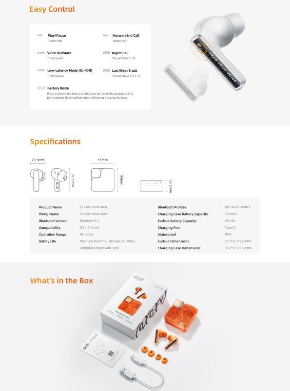 Elegantní, plně transparentní nabíjecí pouzdro v cyberpunkovém stylu a technicky inspirovaný design sluchátek dělají z QCY MeloBuds Neo modní doplněk, který skutečné vyniká.