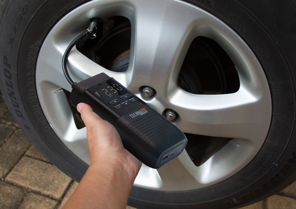 Kompaktní bateriový kompresor, vhodný pro použítí na cestách, dovolené nebo na závodech.