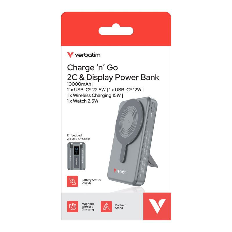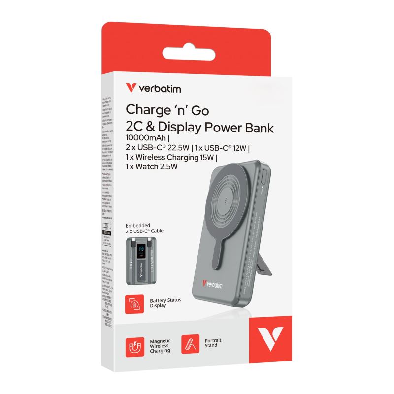 Verbatim magnetická bezdrátová powerbanka Charge 'n' Go C+C, displej, 10000 mAh, šedá