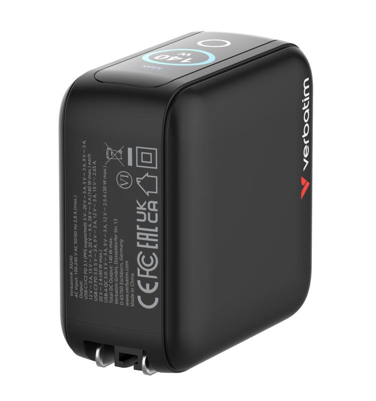 Výkonná síťová nabíječka Verbatim s technologií GaN nabízí celkový výkon až 140 W, čtyři nabíjecí porty a integrovaný TFT displej pro přehled o nabíjení.