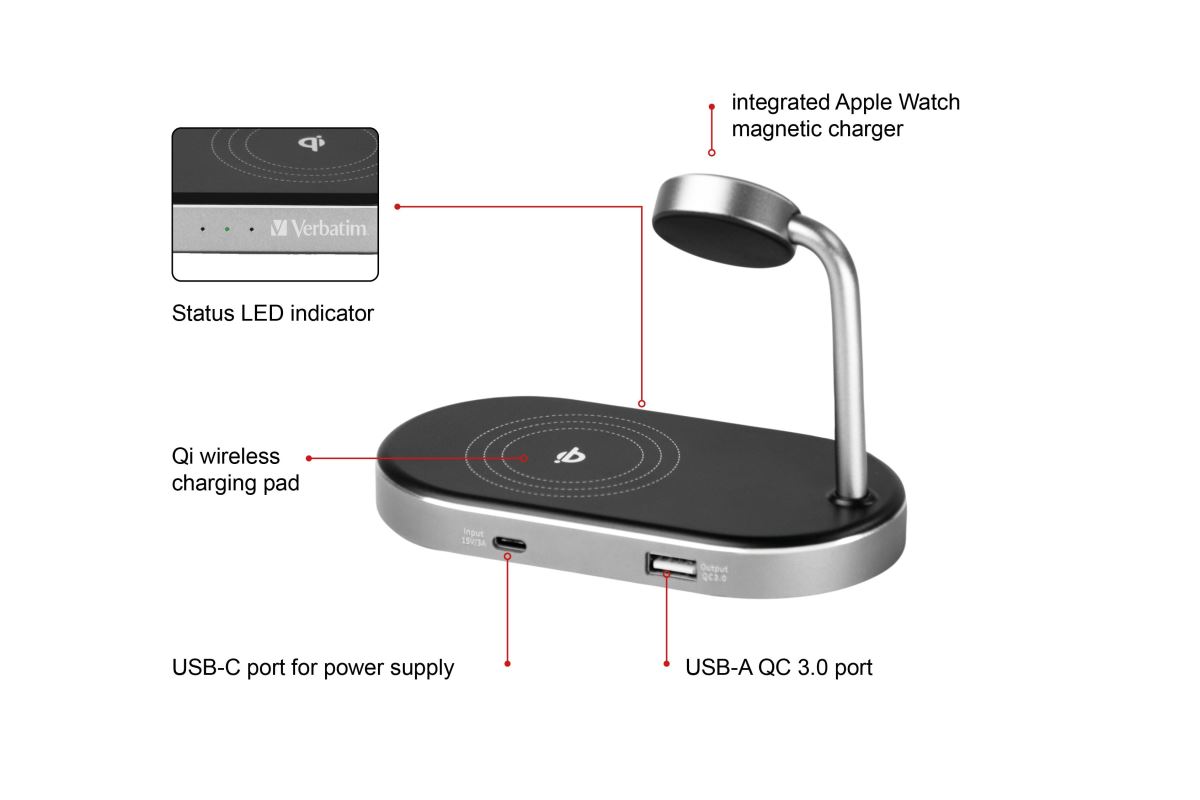 S Verbatim nabíjecí stanicí 3 v 1 můžete bezdrátově nabíjet hodinky Apple Watch, iPhone (8 nebo novější) nebo jiné zařízení s bezdrátovým nabíjením s certifikací Qi a kabelem přes port Quick Charge 3.0 USB-A třetí zařízení.