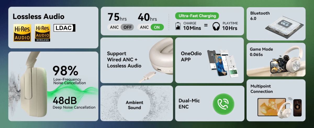Block out the chaos. Drop into your zone. — With hybrid ANC up to -48dB, surrounding Cinema Mode, and Hi-Res audio with LDAC, the Focus A6 keeps your sound bold and your style sharp. Personalize your vibe with the smart app. Stay connected with Bluetooth 6.0 dual pairing. Power through your week with up to 75 hours of playtime.