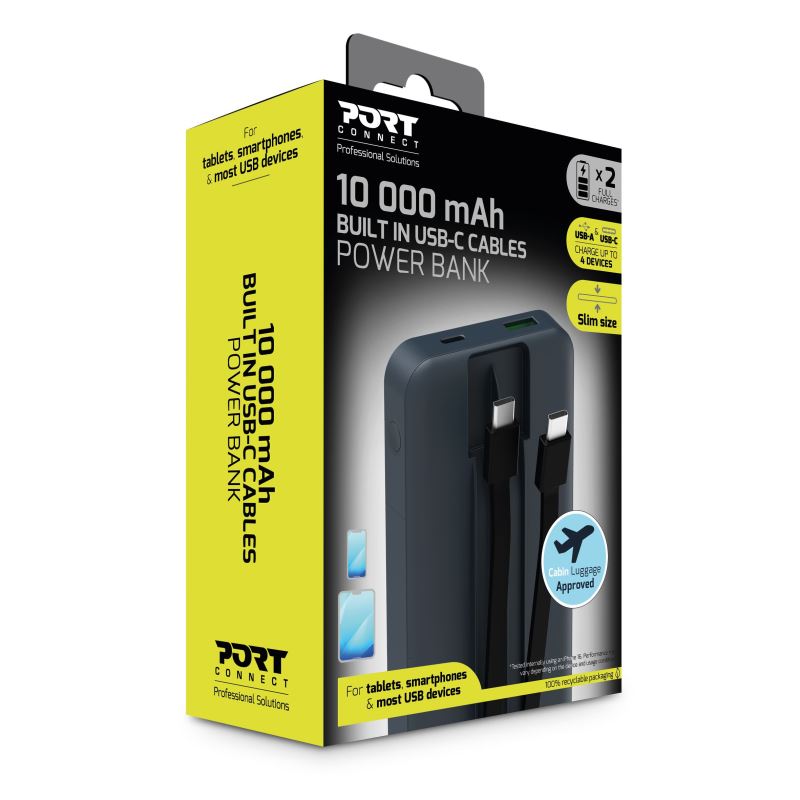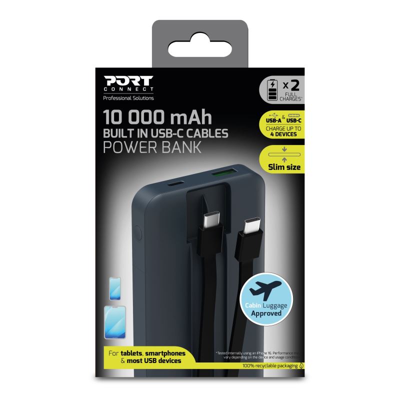 PORT CONNECT 10,000 mAh power bank with built-in USB-C cables offers exceptional practicality without the need to carry additional accessories.