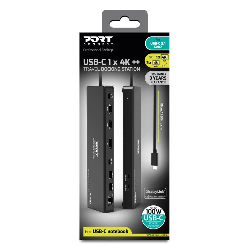 PORT CONNECT Universal USB-C Travel Docking Station, 1× 4K / 3× Full HD