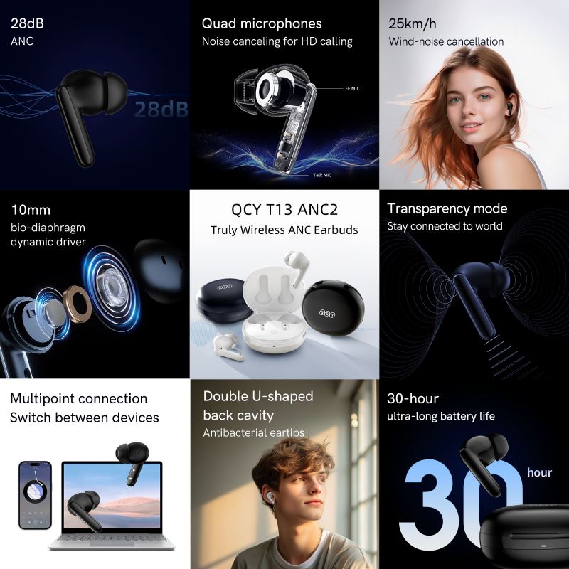 The QCY T13 ANC 2 wireless earbuds deliver a balanced sound profile and advanced Active Noise Cancellation (ANC) technology with up to 28 dB noise reduction, letting you focus fully on your music or calls.