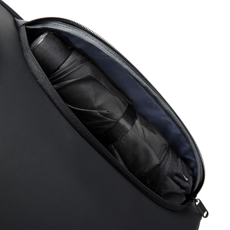 The backpack also includes a closed umbrella compartment that keeps other contents dry.