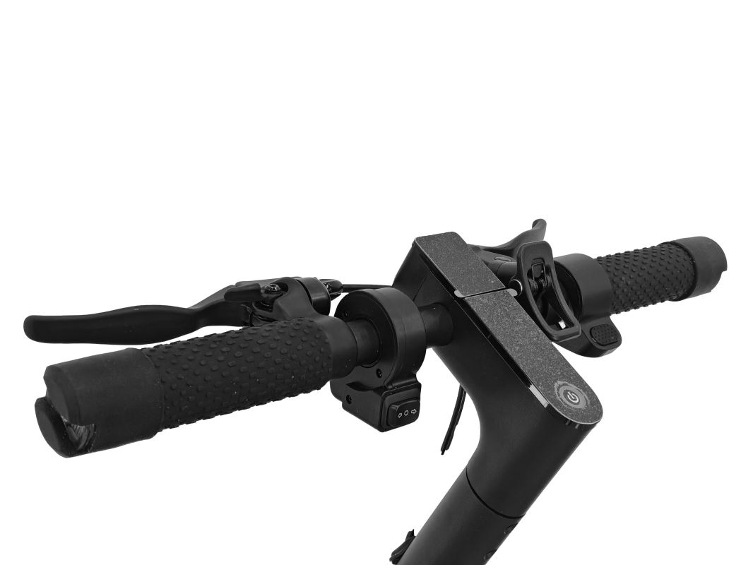 Palcový akcelerátor reaguje plynule na pohyb prstu, zatímco displej zobrazuje rychlost, stav nabití i režim jízdy.