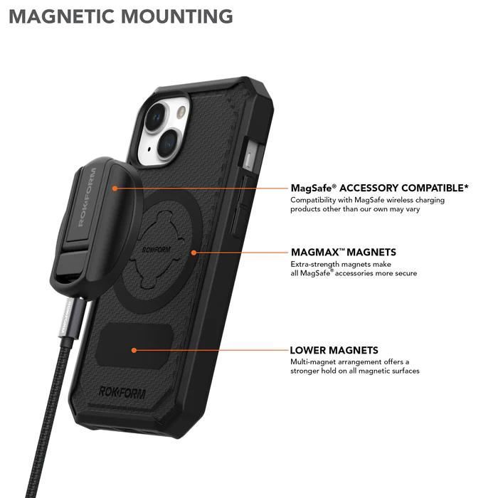 Nové pouzdro Rugged iPhone 15 je kompatibilní se všemi Rokform twist-lock a magnetickými držáky a také poskytuje bezpečné upevnění na auta, kola, motocykly, golfové vozíky a jakýkoli magnetický povrch.