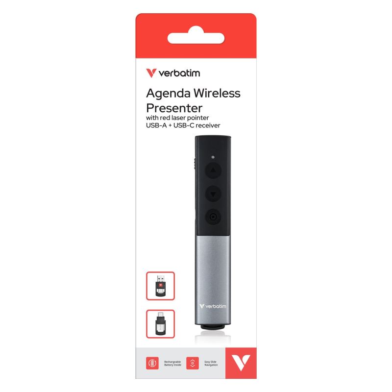 Bezdrátový prezentér Verbatim Agenda vám poskytne úplnou kontrolu nad prezentací, ať už jste v zasedací místnosti, v učebně nebo online. Díky intuitivní navigaci po snímcích, přepínání obrazovky a červenému laserovému ukazovátku, které je viditelné až na 100 metrů, zůstane vaše sdělení jasné a profesionální. Je navržen pro jednoduchost a funguje ihned po vybalení z krabice - stačí připojit přijímač USB a začít prezentovat. Žádný software, žádné potíže, jen výkon, na který se můžete spolehnout.