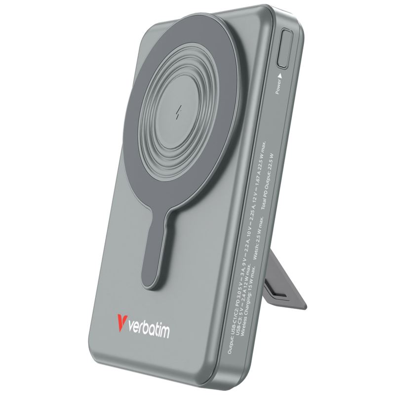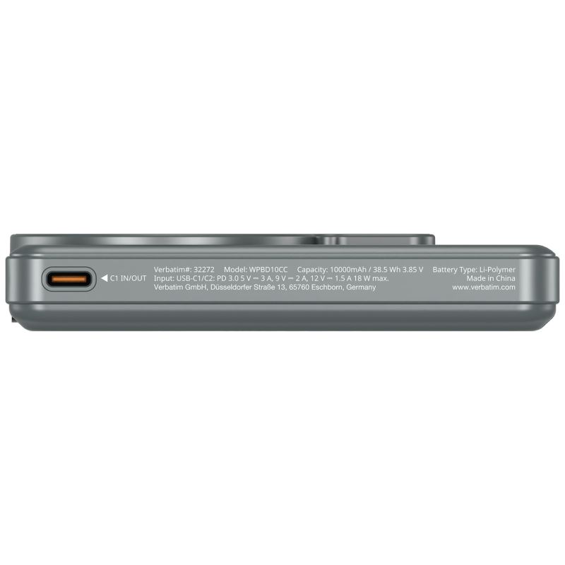 Verbatim magnetická bezdrátová powerbanka Charge 'n' Go C+C, displej, 10000 mAh, šedá