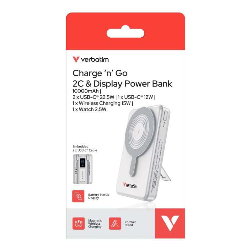 Verbatim magnetická bezdrátová powerbanka Charge 'n' Go C+C, displej, 10000 mAh, stříbrná