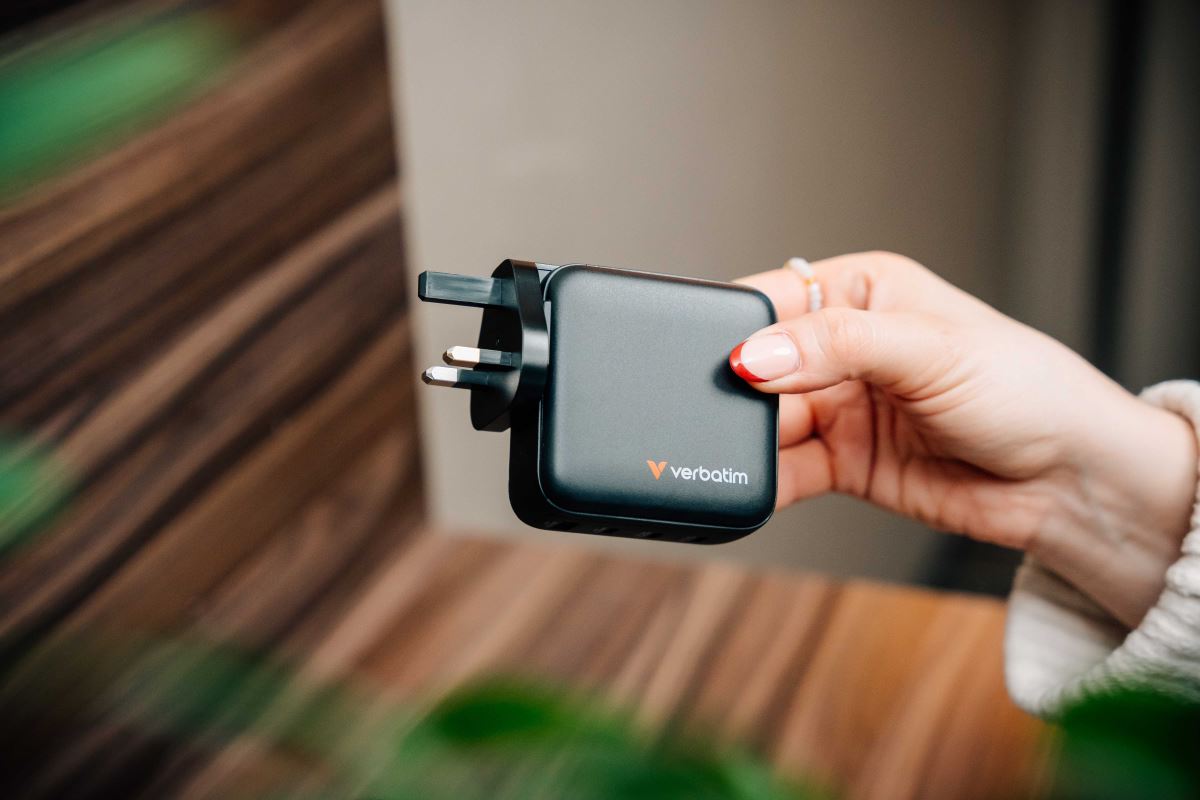 Výkonná síťová nabíječka Verbatim s technologií GaN nabízí celkový výkon až 140 W, čtyři nabíjecí porty a integrovaný TFT displej pro přehled o nabíjení.