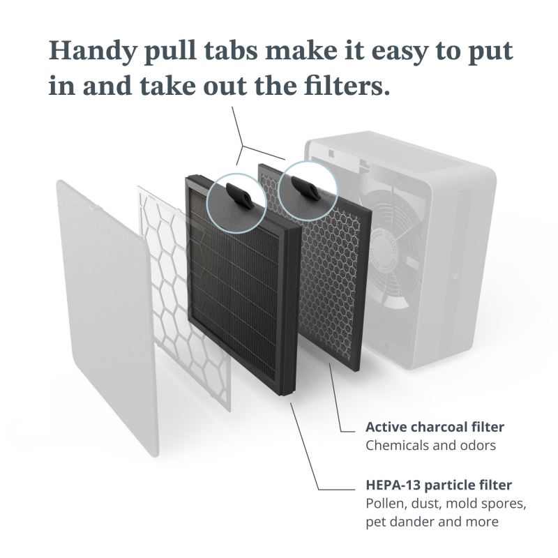 - The combination of a HEPA-13 filter and an activated carbon filter provides effective protection against various types of airborne pollution, including particulate matter, allergens, odors and chemicals.