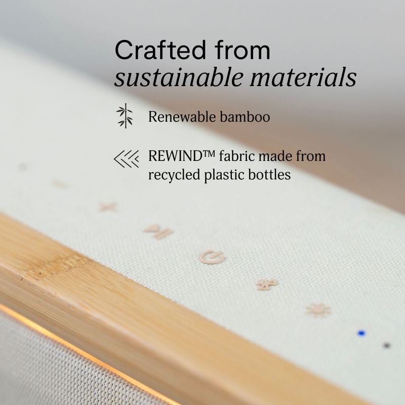 The sleek design combines bamboo and REWIND™ fabric from recycled materials, underlining a commitment to sustainability.