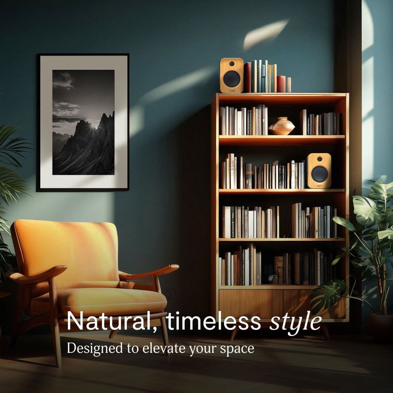 The elegant surface of natural bamboo combined with REWIND™ fabric gives the speakers a unique look.