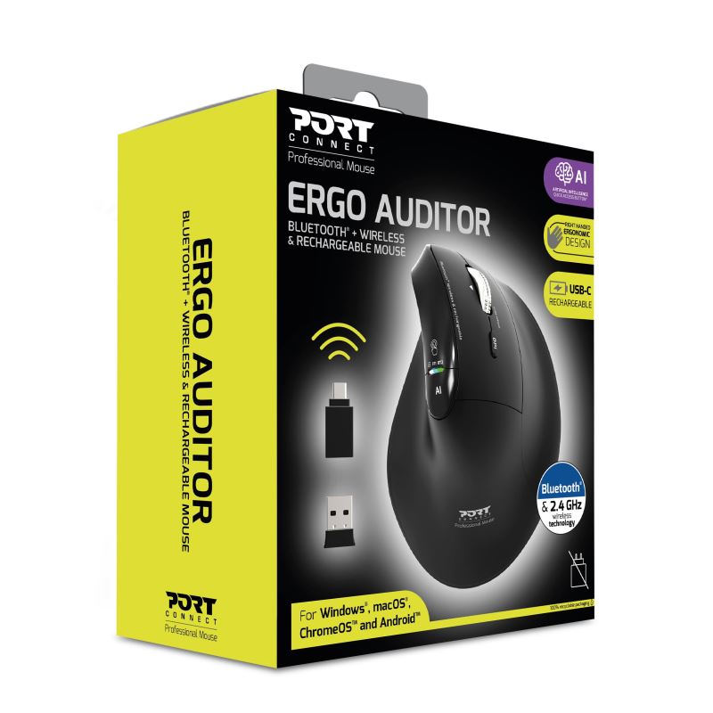 PORT CONNECT ERGO AUDITOR, ergonomic Bluetooth and 2.4GHz wireless rechargeable mouse, USB-C, Black