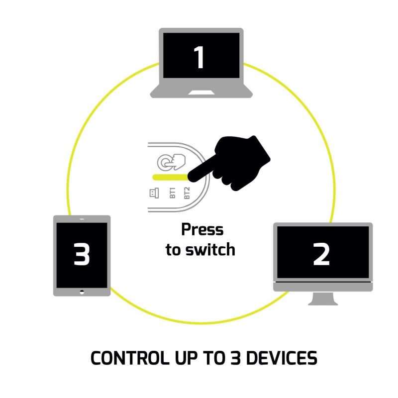 The mouse can be used with multiple devices simultaneously – 1 via 2.4GHz receiver and 2 via Bluetooth® – without the need for re-pairing.