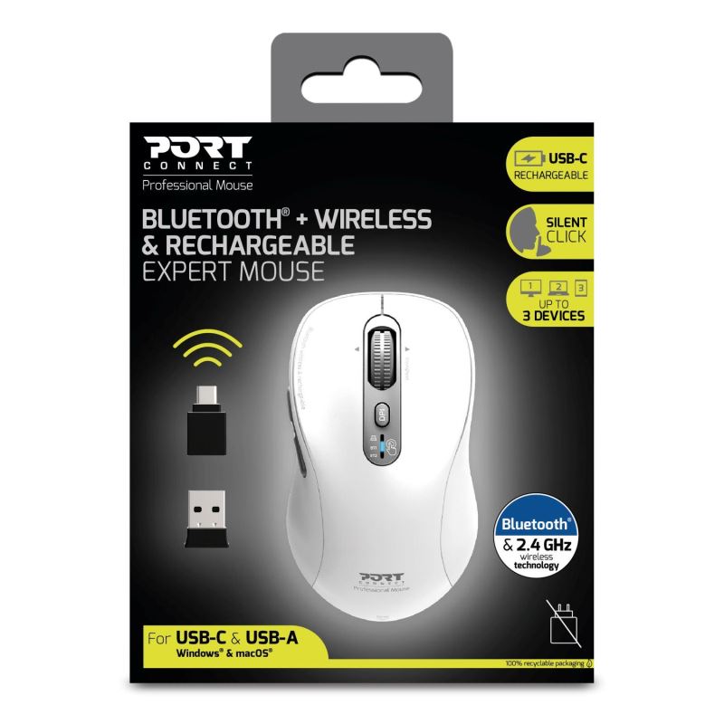 PORT CONNECT EXPERT, Bluetooth and 2.4GHz wireless rechargeable mouse, USB-C, White