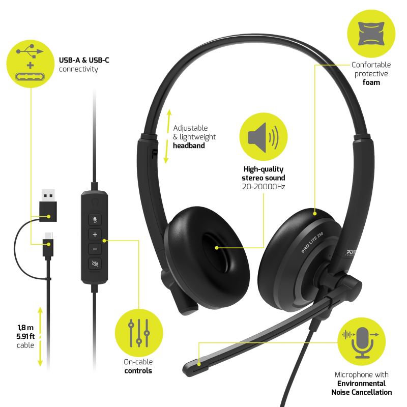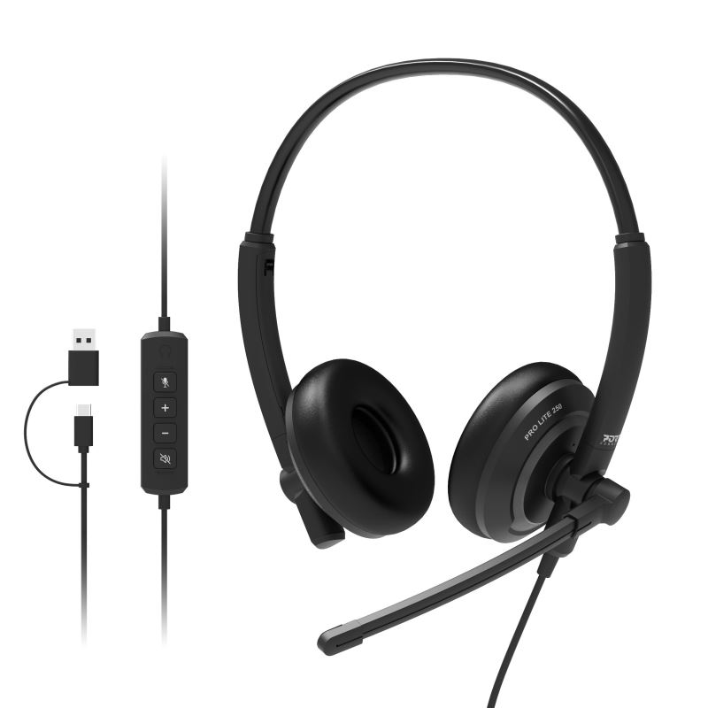 The PORT CONNECT PRO LITE 250 USB stereo headset features a hard-wired USB-A and USB-C connection, ensuring instant compatibility and operation without the need to install drivers.
