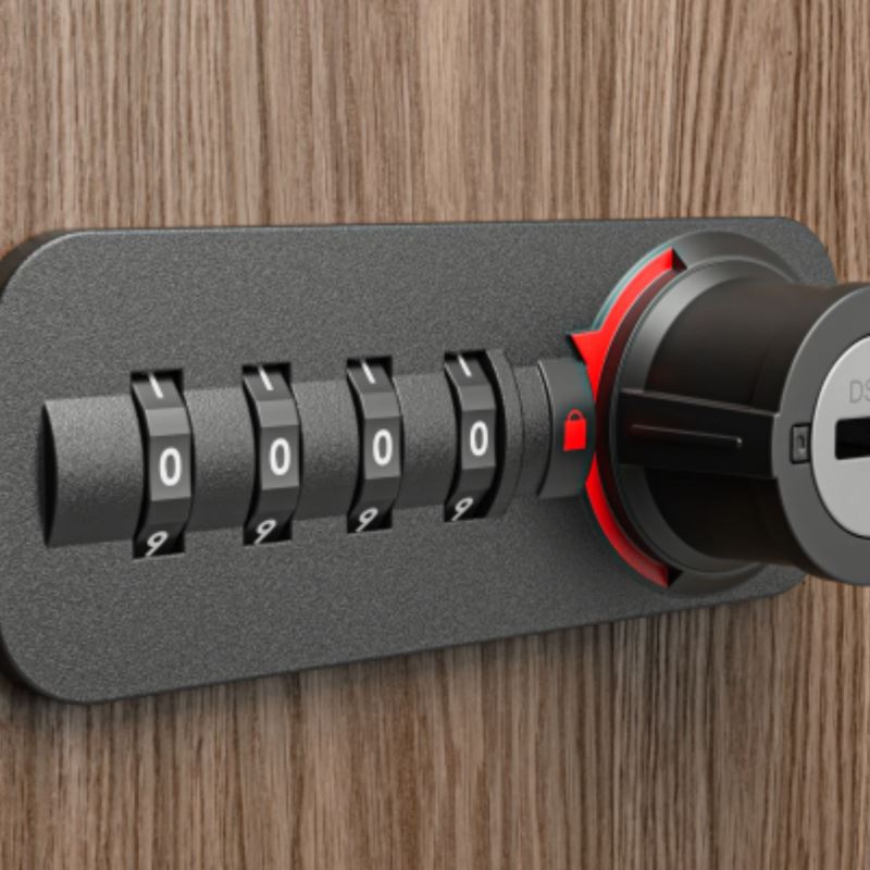 Access to the cabinet is protected by a four-digit combination lock with a master key key.