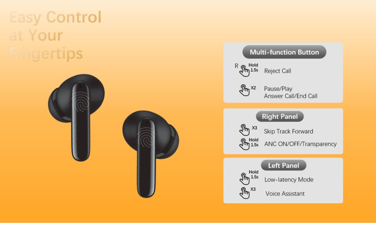Touch controls allow you to switch between ANC, Transparency, or Low-Latency Mode, manage music, or handle calls effortlessly.