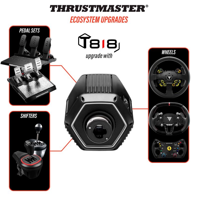 The Thrustmaster T818 Black Edition is a Direct Drive base for PC that provides undistorted Force Feedback and demanding torque of up to 10 N·m.