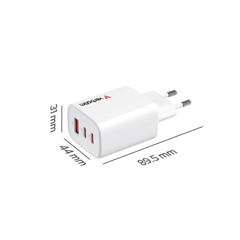 Verbatim GaN Travel Charger Essentials 65W, 2×USB-C PD, 1×USB-A QC, EU Plug, White